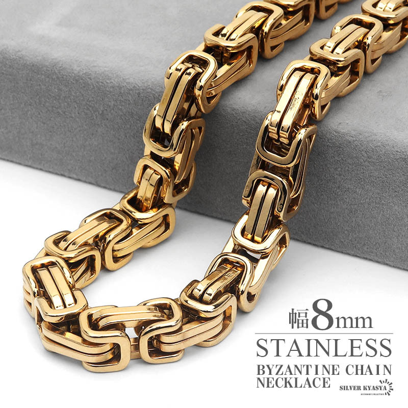 - (50cm) ステンレス ごつめチェーン ネックレス 幅8mmネックレス ビザンチンチェーン スクエア ごつい ゴールド 金