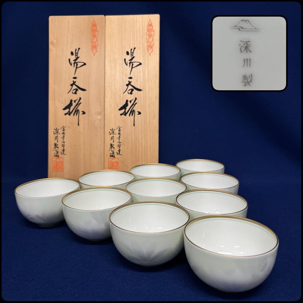 > 未使用 深川製磁 金彩 淡緑木蓮文 丸福 煎茶碗 10客セット 共箱 煎茶器 湯呑み 汲出茶碗 宮内庁御用達 極美品 (02067E