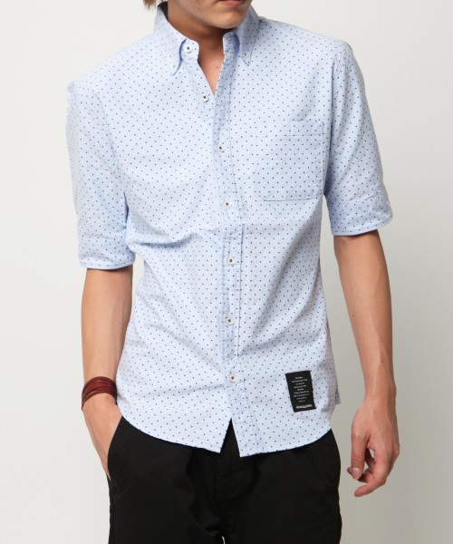 > 新品未使用VJS2087サイズL日本製Made in Japan【VANQUISH紳士五分袖ボタンダウンドットオックスフォードシャツサックス】カジュアルシャツ