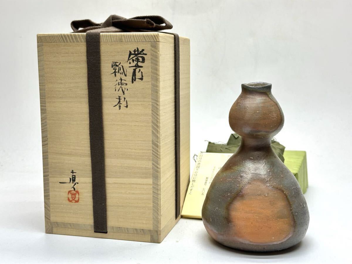 - 中村真 備前 瓢徳利 赤かせ 共箱 共布 栞 父 中村六郎 ④