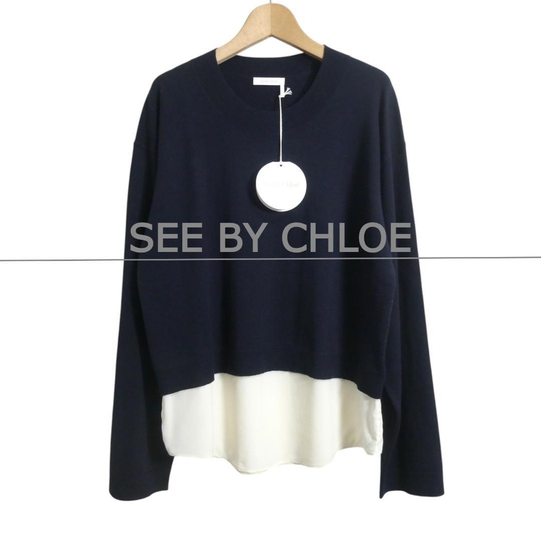 > 新品 未使用 SEE BY CHLOE シーバイクロエ サイズL フェイクレイヤード クルーネック 長袖 ニット セーター プルオーバー 紺 ネイビー