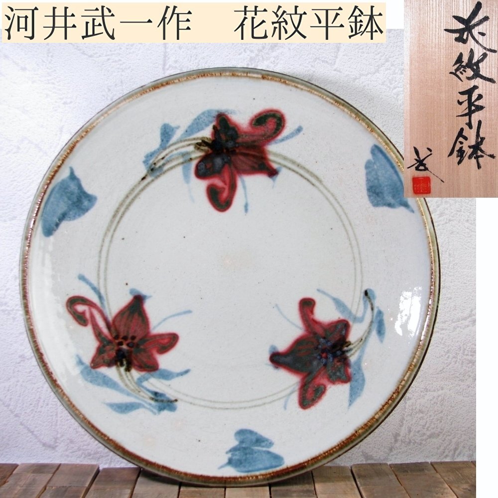 - 河井武一作 花紋平鉢 大型 幅:41cm 極美品 共箱/25b027