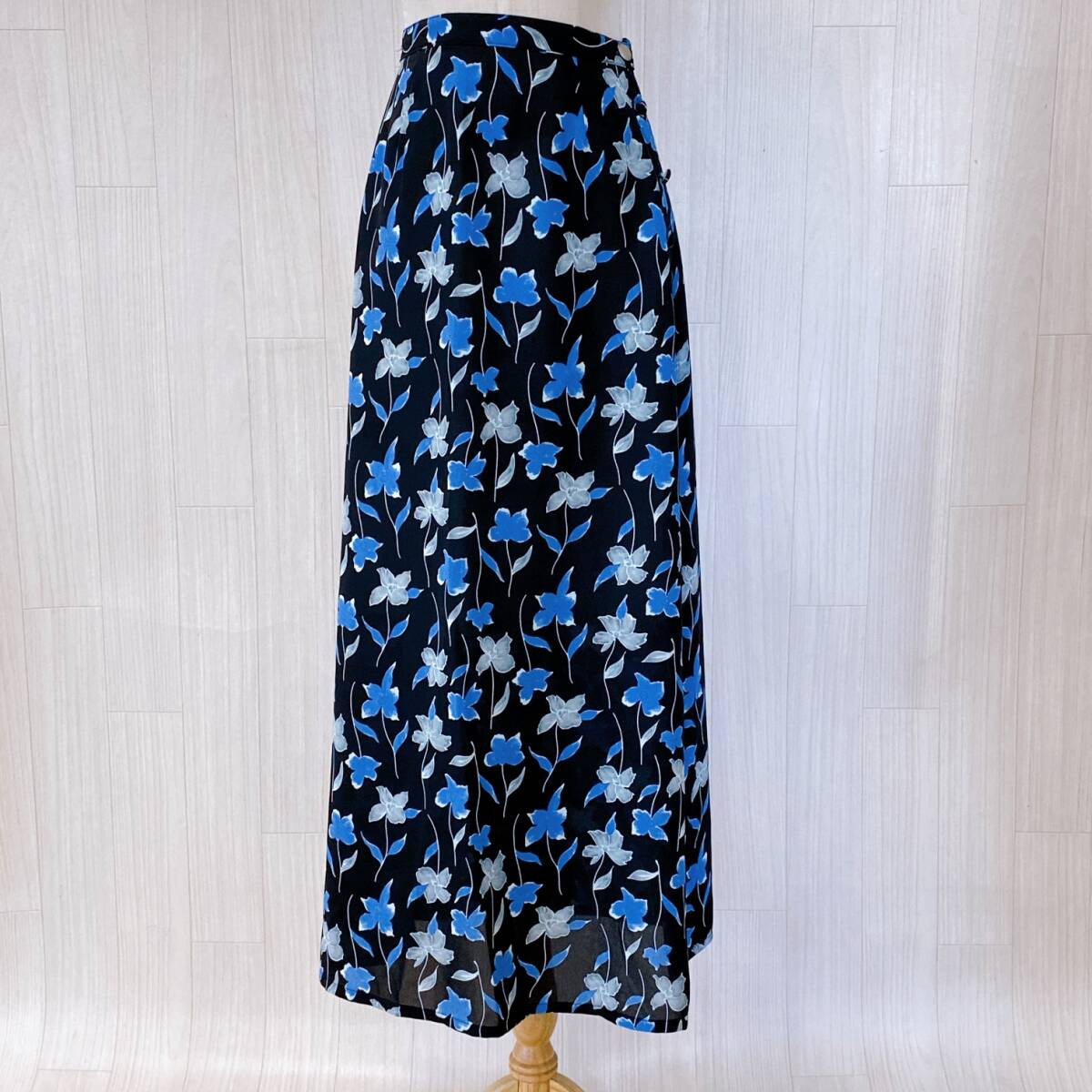 > Y1703 vasagia collection レディース スカート フレアスカート ロング丈 ボタン開閉 予備ボタン 裏地 透け感 M~L 黒青 花柄ボタニカル上品