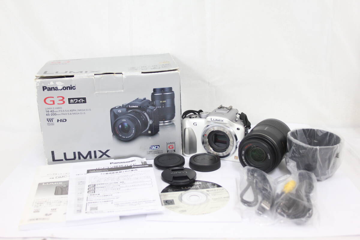 > 【返品保証】 【元箱付き】パナソニック Panasonic LUMIX DMC-G3 ホワイト 45-200mm F4-5.6 バッテリー付き ミラーレス一眼 M3001