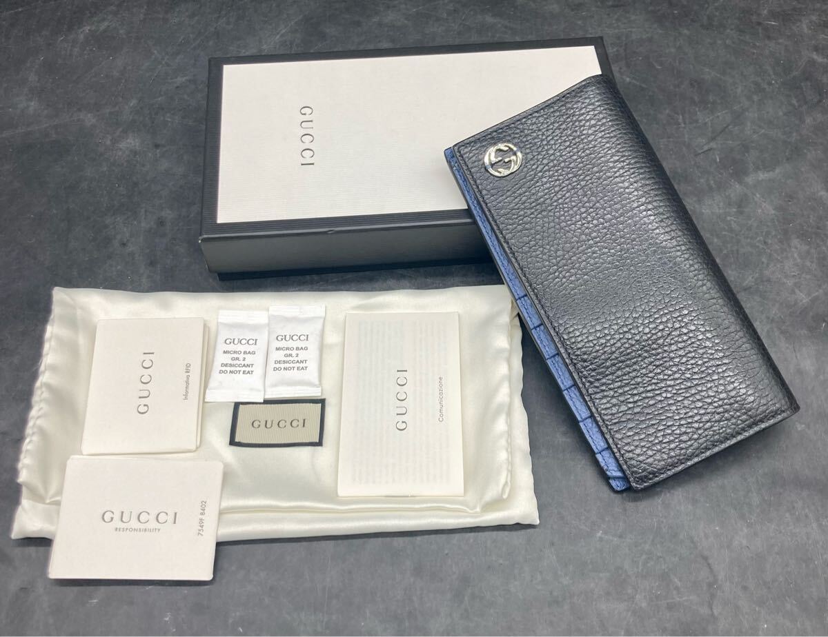 - 1305 GUCCI グッチ 二つ折り長財布 インターロッキングG 610467・2778 財布 メンズ長財布 ブラック×ブルー 袋 箱有