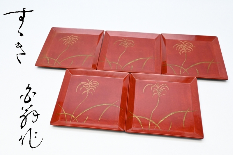 - 蒔絵皿 漆器 在銘 ■ 銘々皿 蒔絵[ ススキ ] 5客 ■ 天然木 菓子皿 茶道具 木箱入り■