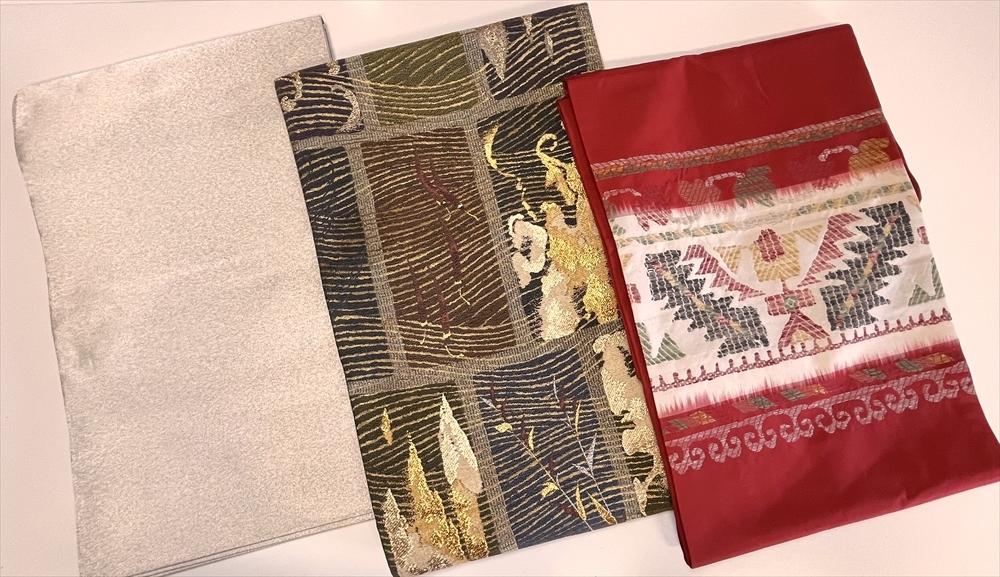 - 花とら●リサイクル帯 袋帯2本 名古屋帯1本 銀 綴風 ボタニカル 唐辛子 赤 モダン 250121