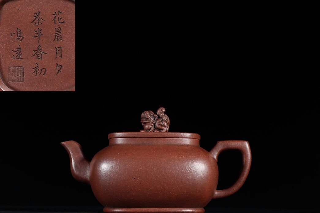 - ▼渡鶴羽▼E785時代朱泥 瑞獣鈕四方紫砂壺 在銘 陳鳴遠 清時代/紫砂 煎茶道具 朱泥 茶壺