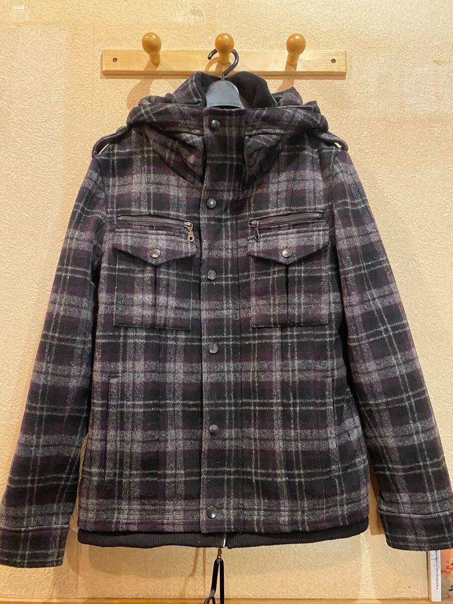 - 未使用gazelleメルトンチェックワークジャケットライダースフードパーカー検索ウールコートアウタージャンパーチェックトラッカーフーディL