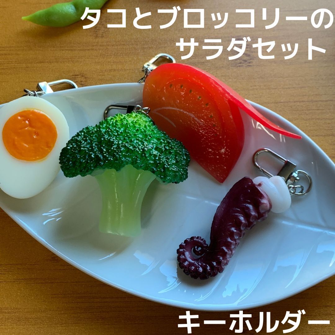 - 食品サンプル キーホルダー たこ トマト ブロッコリー ゆでたまご サラダ 4点セット ストラップ バッグ リュック タコ たまご 玉子 タマゴ