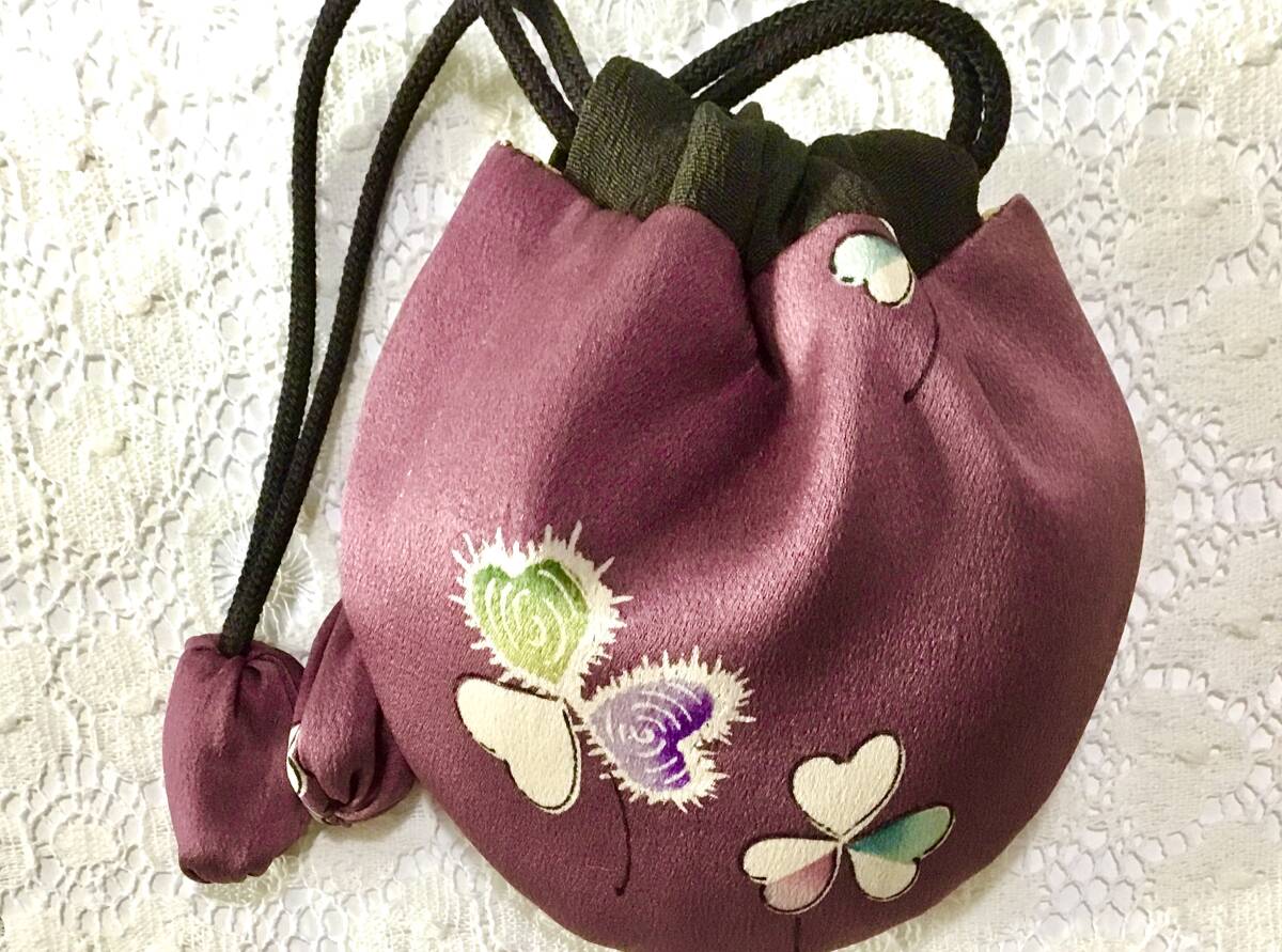 - 古布694小丸袋・絹( クローバー・三つ葉) 時代着物地