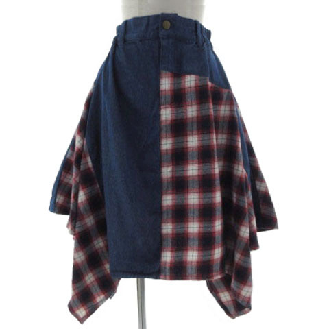 - スカラー ScoLar スカート フレア アシンメトリー デニム切替え ミディ丈 ウエストゴム コットン チェック ブルー 青 赤 紺 白 M