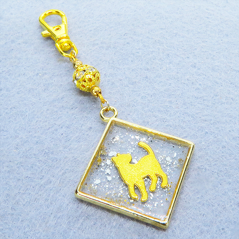 - ゴールドカラー 振り向き猫のスクエア型チャームキーホルダー クリアカラーレジン 金具変更可