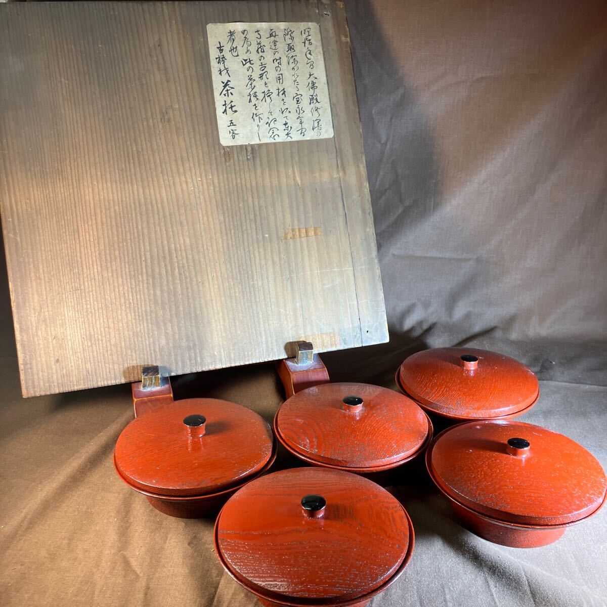 - 東大寺 古欅材 茶托 五客 蓋付天目台 共箱 煎茶道具 木製漆器 蓋付