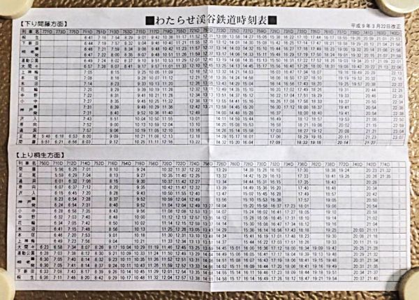 > ■ ゆ-939 わた渓 時刻表 平成9年 3月改正 中古 わたらせ 渓谷鉄道 下り 間藤方面 上り 桐生方面 最大)縦18cm横25.5cm