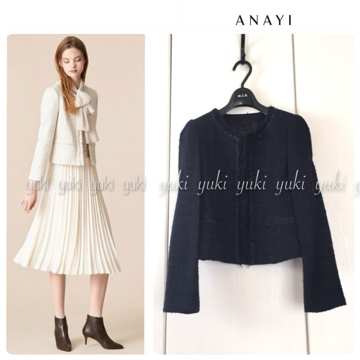 - ANAYI ツイード ノーカラージャケット 36 ネイビー