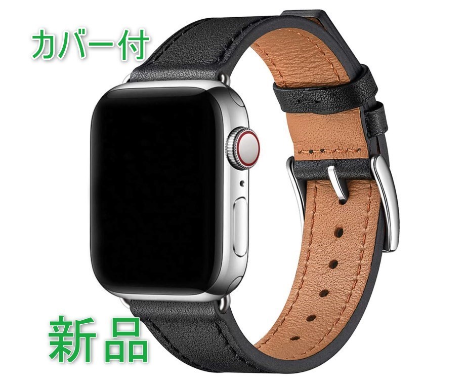 > [新品][送料込] カバー付 apple watch アップルウォッチ バンド 黒/シルバー 42mm 44mm 45mm 本革 *