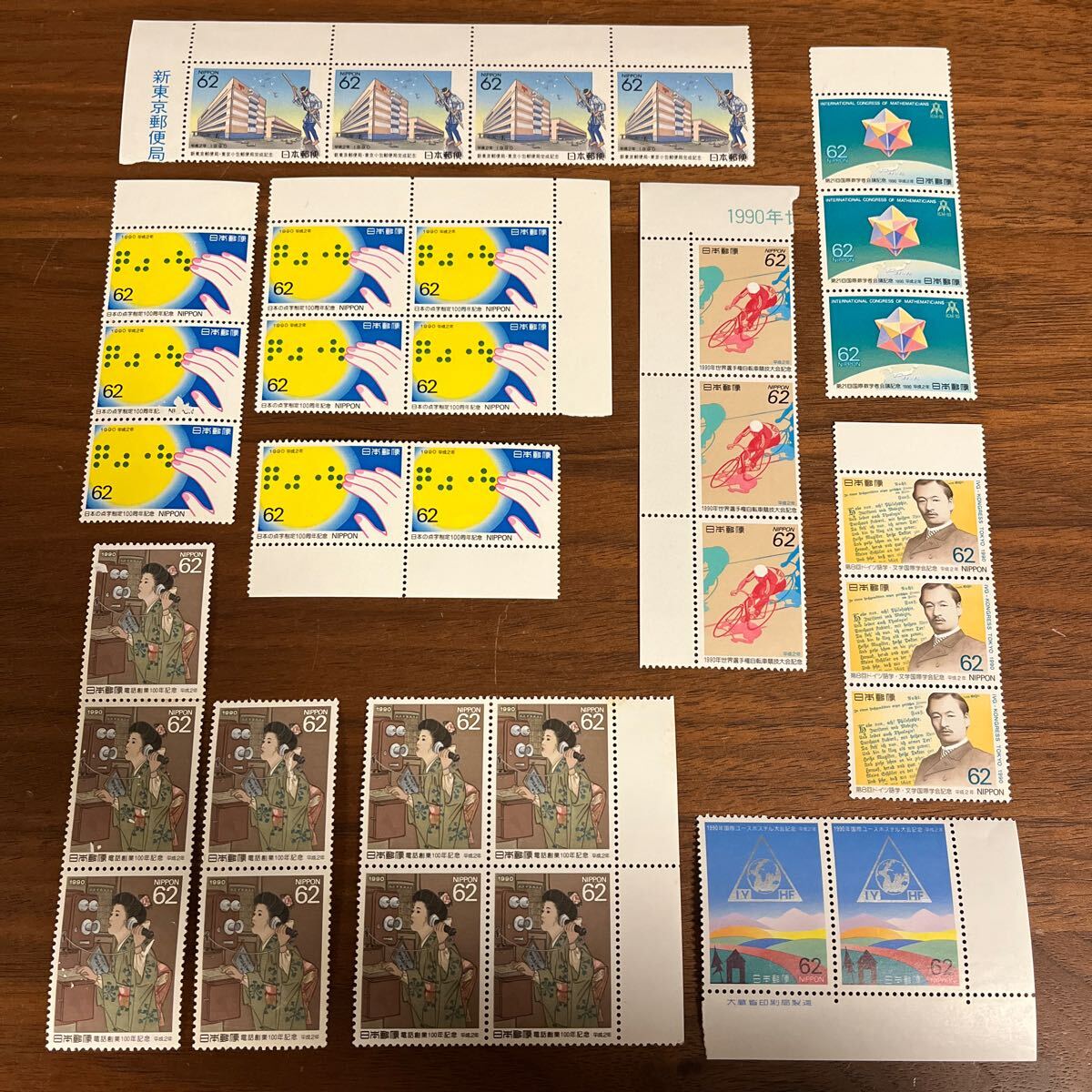 - 切手 1990年 平成2年 7種セット 62円×33枚 額面2,046円 自転車競技大会 電話創業 数学者会議 点字制定 新東京郵便局 ユースホステル大会