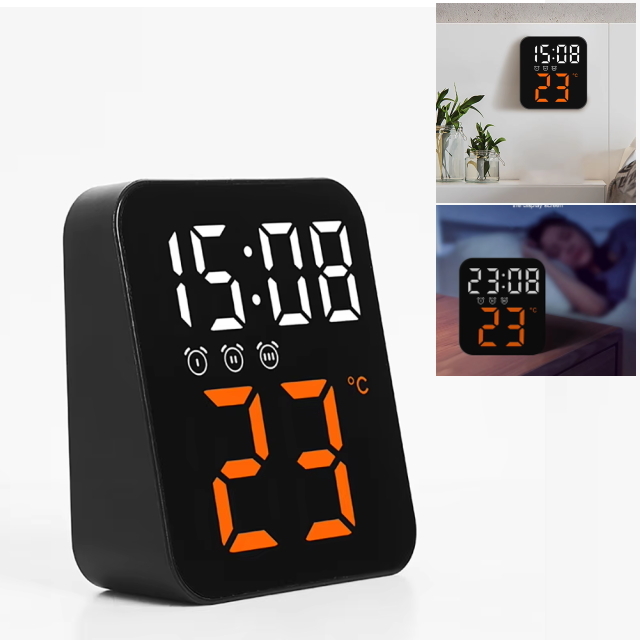 - シンプル高性能 デジタルクロック ブラック文字オレンジ 温度計&時計&アラーム USB電源 乾電池 夜でも見やすいLEDデジタル時計 置型時計