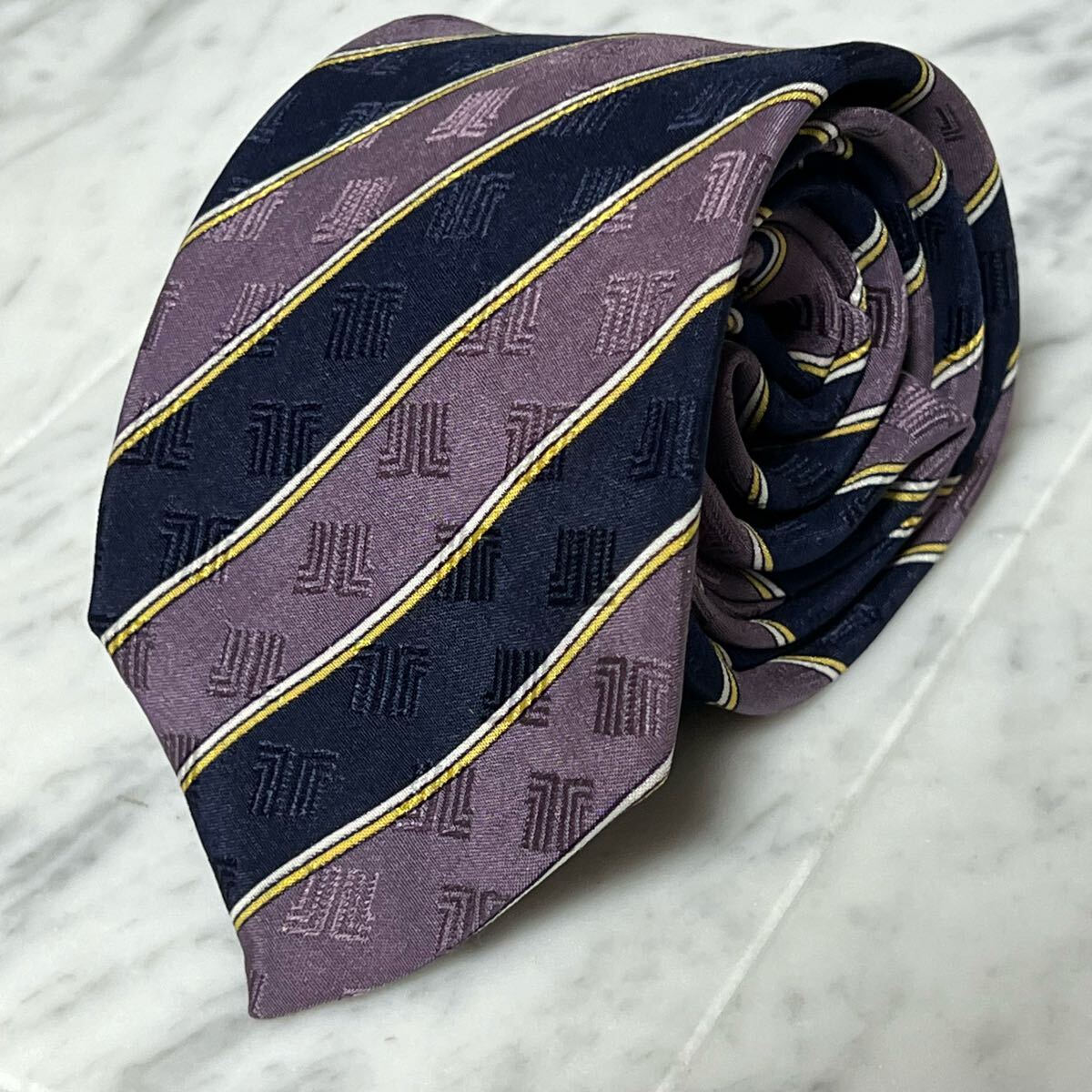 - 【美品】 999円~ LANVIN ネクタイ ストライプ ロゴ総柄 ネイビー パープル (B12)