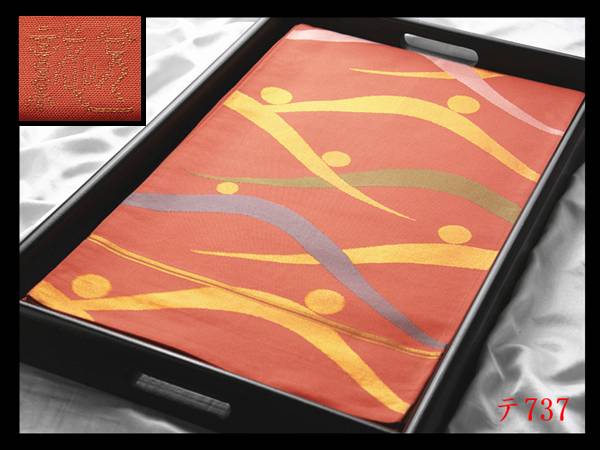 - 蔵【テ737】西陣逸品 名門機屋「織悦」 本袋 珊瑚朱色地 正絹純金糸全通高級美術袋帯 ◇検◇簪着物名古屋帯和装小物帯締め
