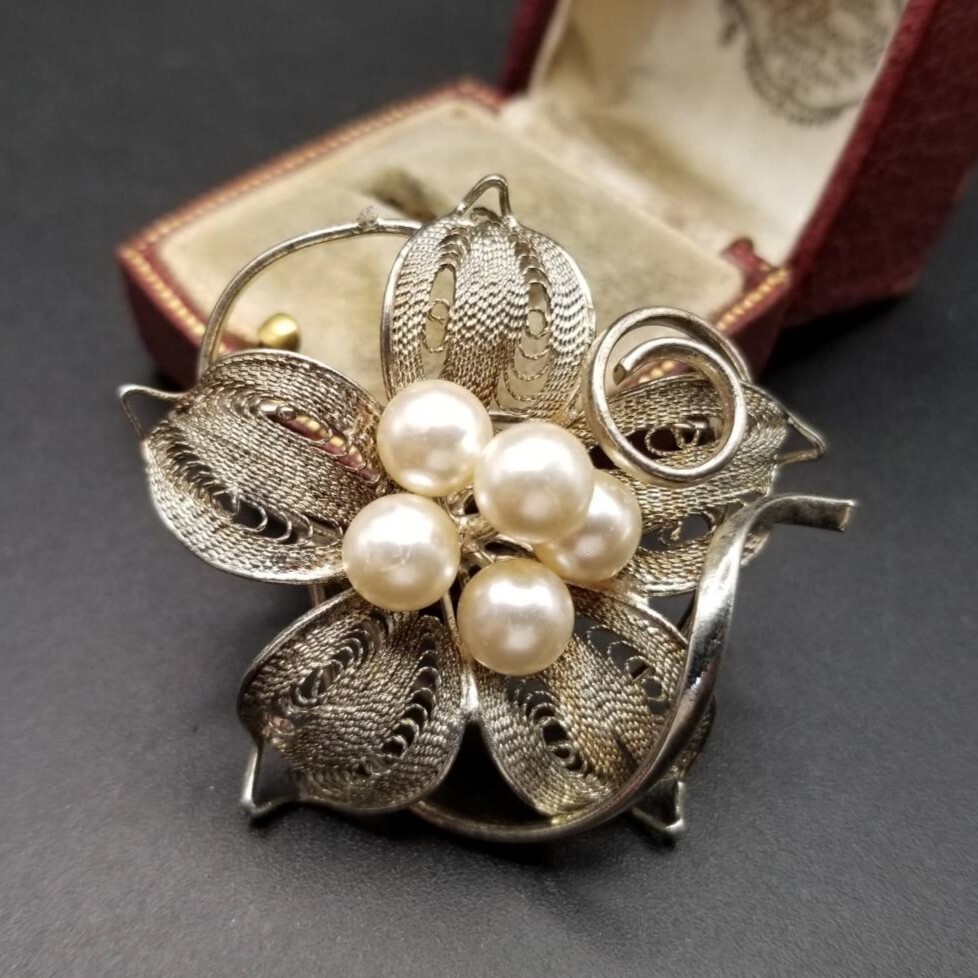 > フローラル パール装飾 フィリグリー 立体アート ヴィンテージ フラワー ブローチ 花 レトロ エレガント フォーマルにも Y6-L