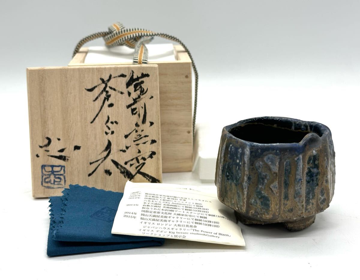 - 日本橋三越個展作 馬場隆志 備前 窯変 蒼ぐい呑 面取り 共箱 共布 栞 酒器 ①