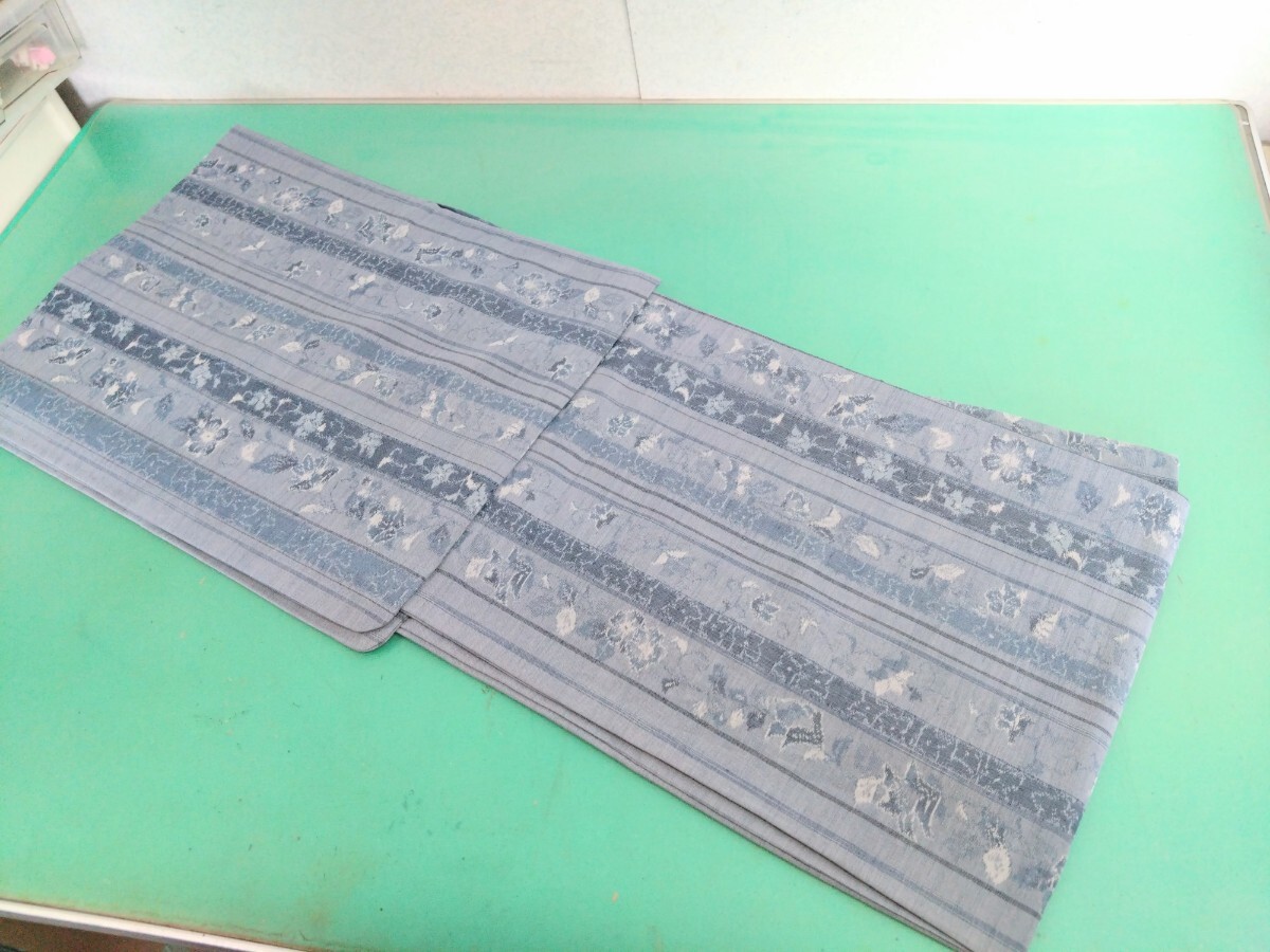 > ● 100 高級 夏 一重 着物 蔦 葉 蔓 花 縦縞 模様 くすみカラー お淑やか ブルーグレー系 紬 ? 小紋 美品 ③