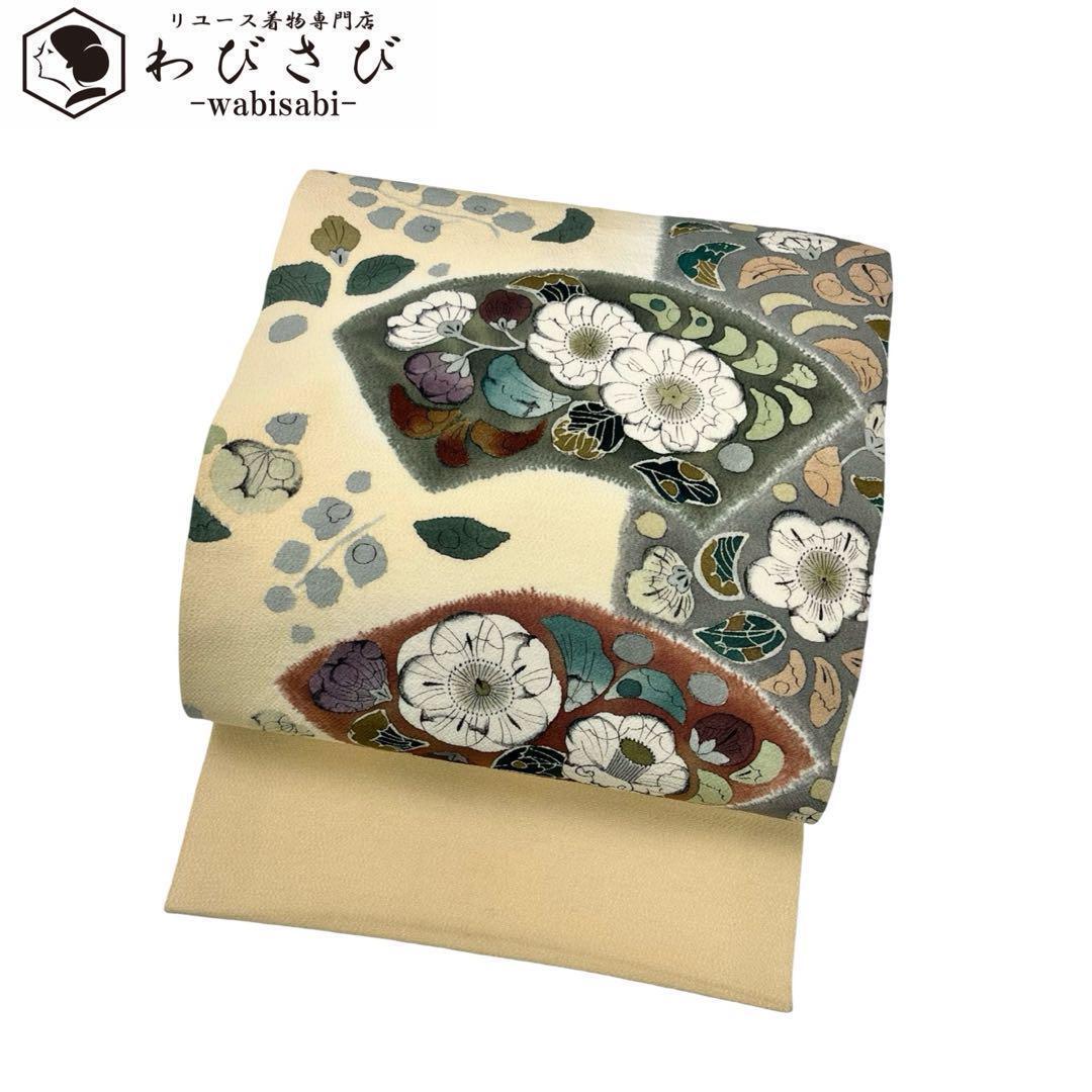- 名古屋帯 手描き 地紙に美しい辻が花模様 薄卵色 縮緬 O-3878 着物 きもの kimono 和服 和装 中古 リサイクル着物 【送料無料】