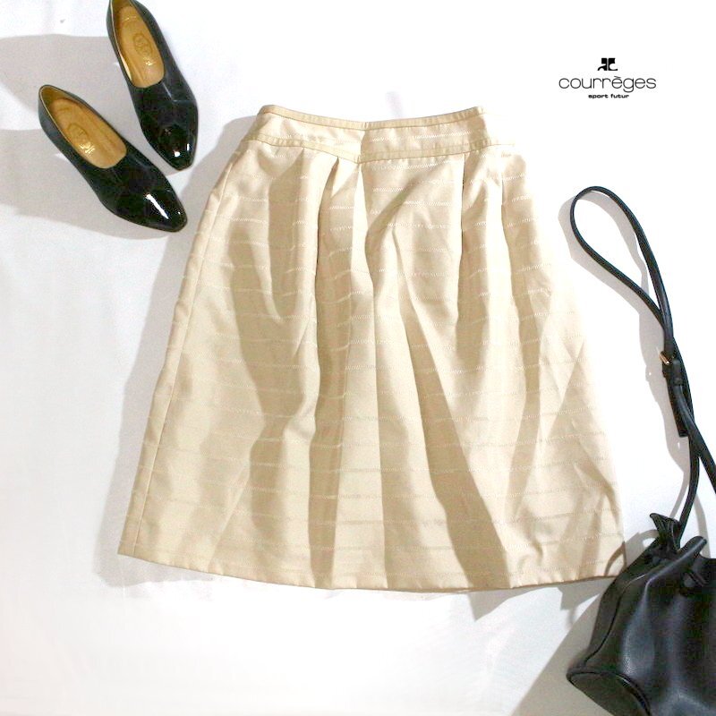 > クレージュ Courreges 春 夏 お洒落 綺麗め 総柄 総ロゴ 刺繍 レザー ほんのり艶 膝下丈 フレアスカート Aライン ベージュ 40 11号