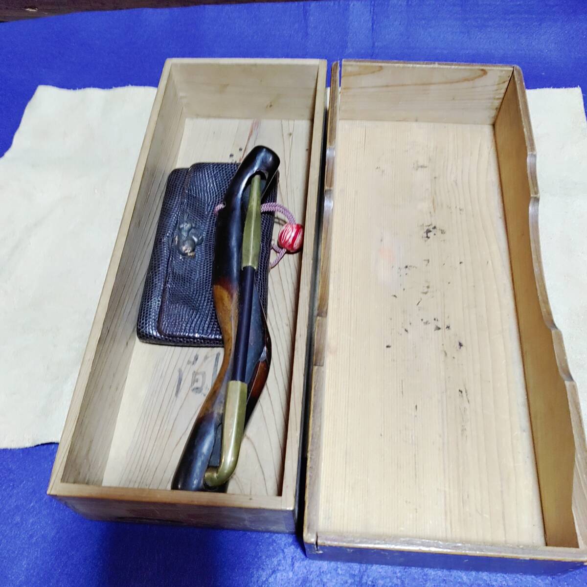 - (鳥羽庵)蔵出し品明治期見事煙草容れカマス部分トカゲ皮、尾締め鶴天玉、煙管受け海松鉛管黄銅製時代箱付