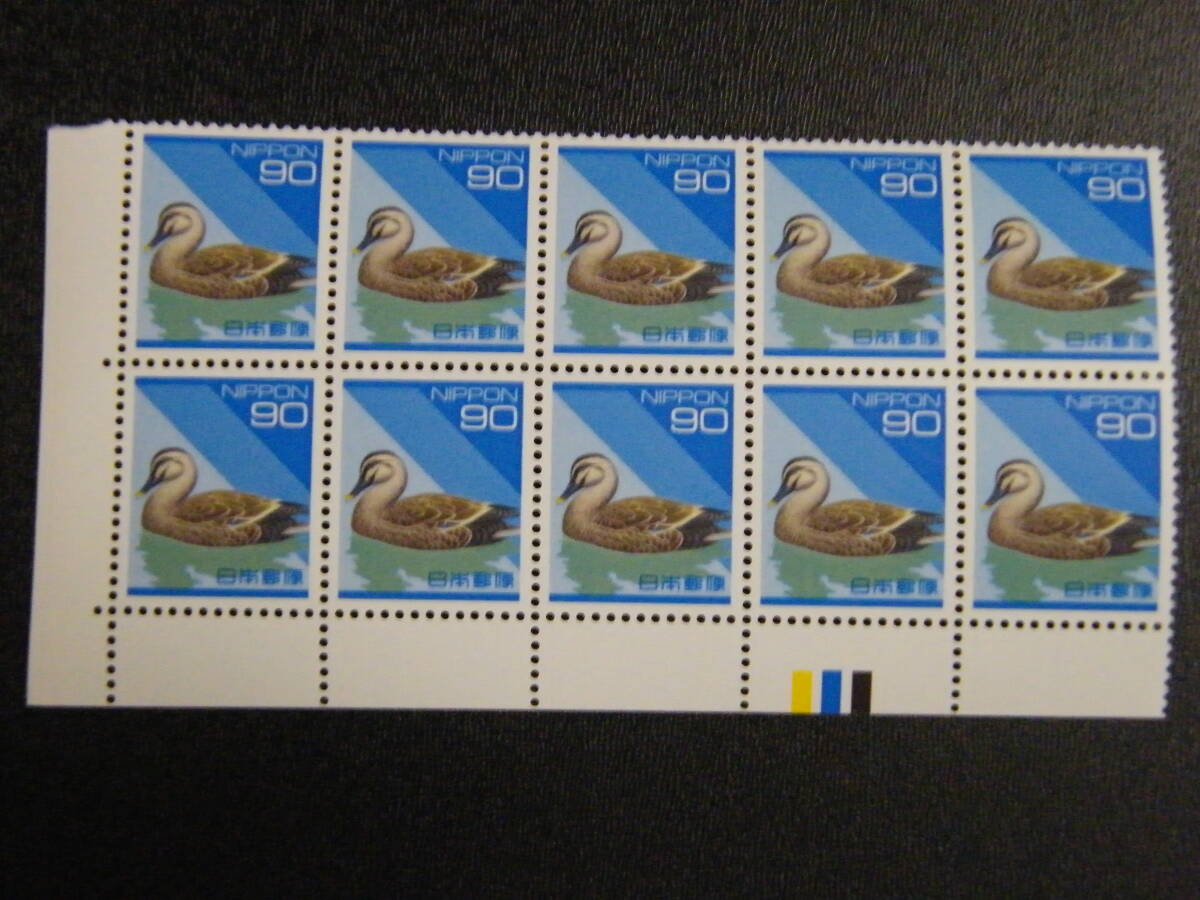 - カルガモ 90円 カラーマーク下 10枚ブロック 未使用 1994年シリーズ
