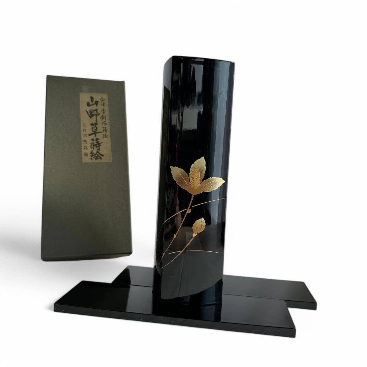 - K7-495 未使用 会津塗創作蒔絵 三代目 惣兵衛 山野草蒔絵 華静か 花生台付 黒 花瓶