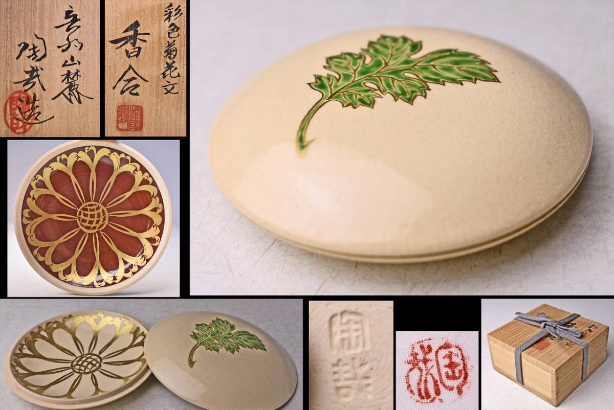 > 沢村陶哉 ★ 彩色 菊花文 香合 ★ 共箱 共布 ★ 父:人間国宝 清水卯一 ★ 雅な逸品 ★ 香道具 茶道具 ★