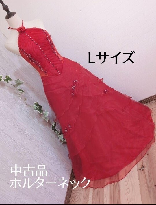 - カラードレス 赤 ロングドレス L ホルターネック オーガンジー ラインストーン ステージ衣装 社交ダンス カラオケ イベント 演奏会 難あり