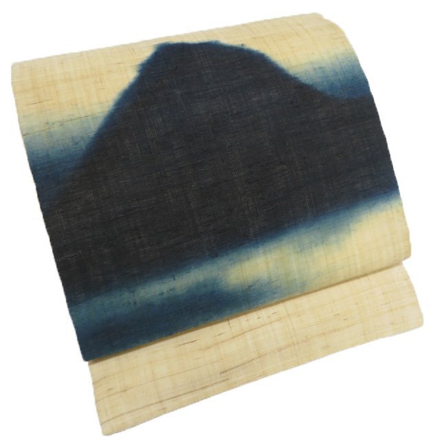 - 夏物 開き名古屋帯 なごや帯 未使用 麻 カジュアル 仕立て上がり 風景 遠山 薄い枯色 濃藍色 きもの北條 A1160-16