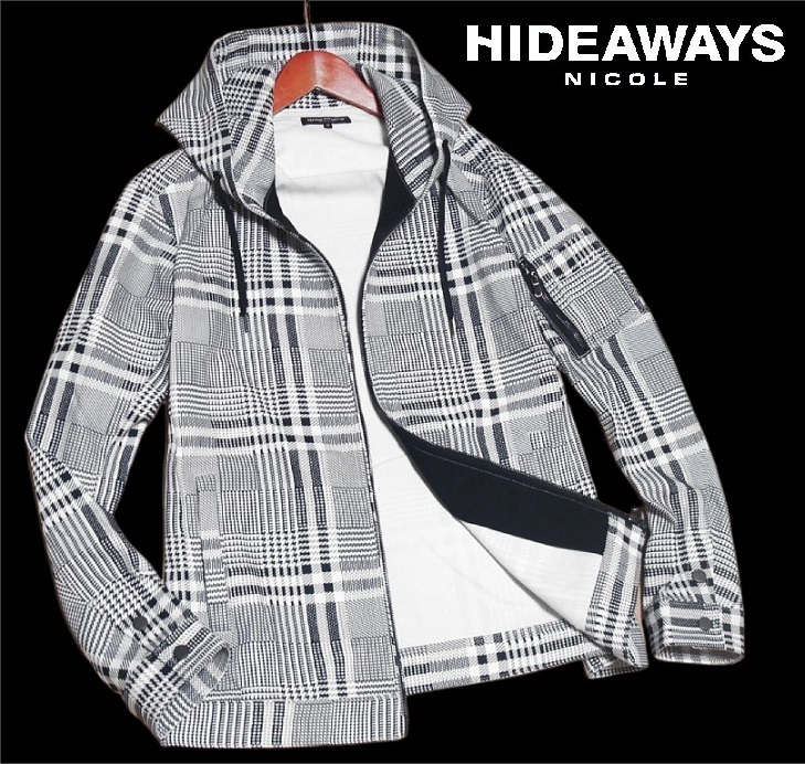 > 新品!! ハイダウェイ ニコル ストレッチ ミリタリー パーカー チェック 48 (L) ☆ HIDEAWAYS NICOLE メンズ MA-1デザイン フード 白黒 ★