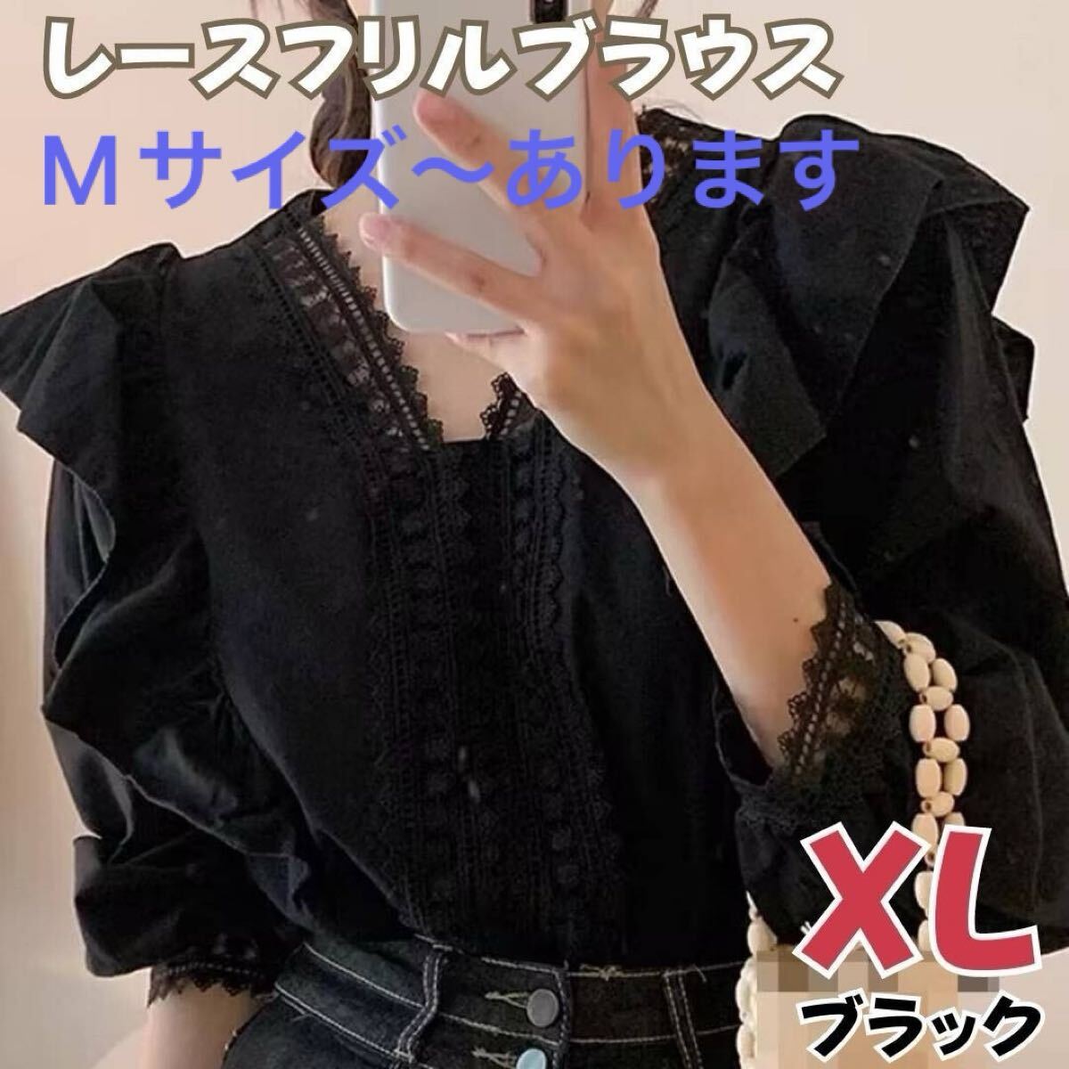 - .レース フリル ブラック Vネック XL ブ 7分袖 ぽわん袖 シャツ