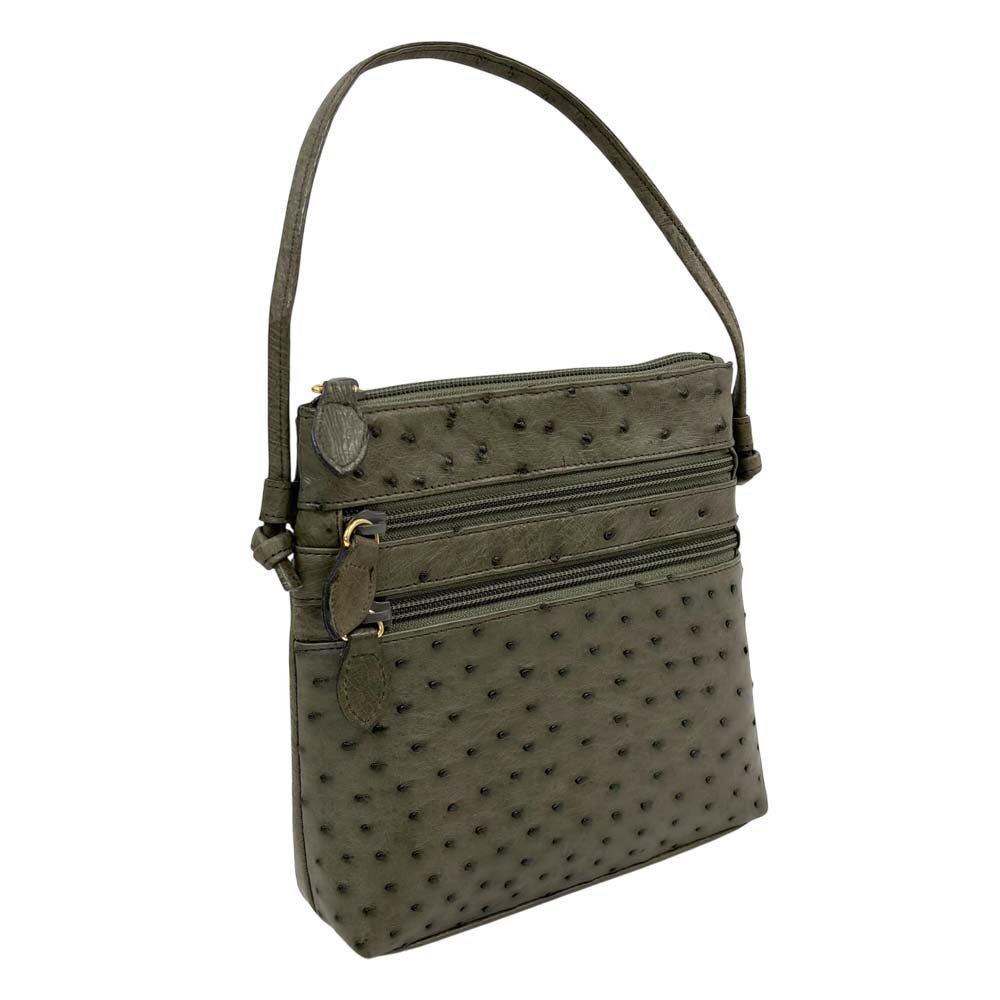 - 25-1004 【良品】 オーストリッチ ショルダーバッグ 肩掛け ファスナー開閉式 グリーン系 緑系 ミニバッグ コンパクト 小さめ レディース