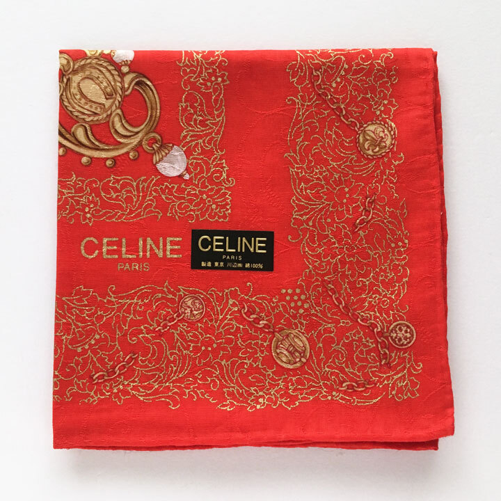 > セリーヌ / CELINE ハンカチ ストラップ柄 金ラメ模様枠 透かし入り赤生地☆20250125【6342】