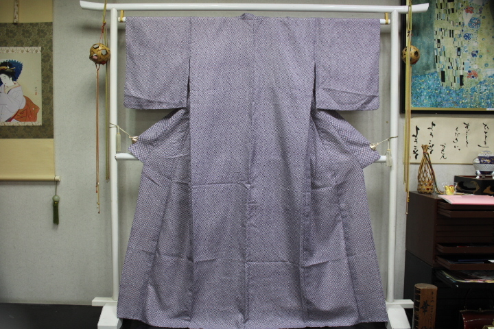 > きもの今昔8342 合繊きもの 広衿単衣仕立きもの 合繊ポリエステル100% 紫紺色地鹿の子柄 身丈166cm