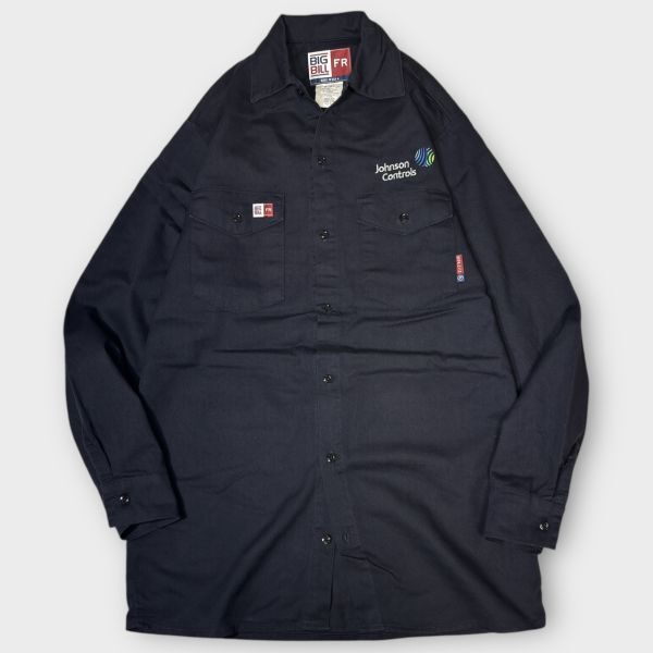 > ★BIG BILL★USA製★Johnson Controls刺繍 長袖ワークシャツ sizeL相当 ネイビー系 ピスネーム スタッフユニフォーム 古着 洗濯済み