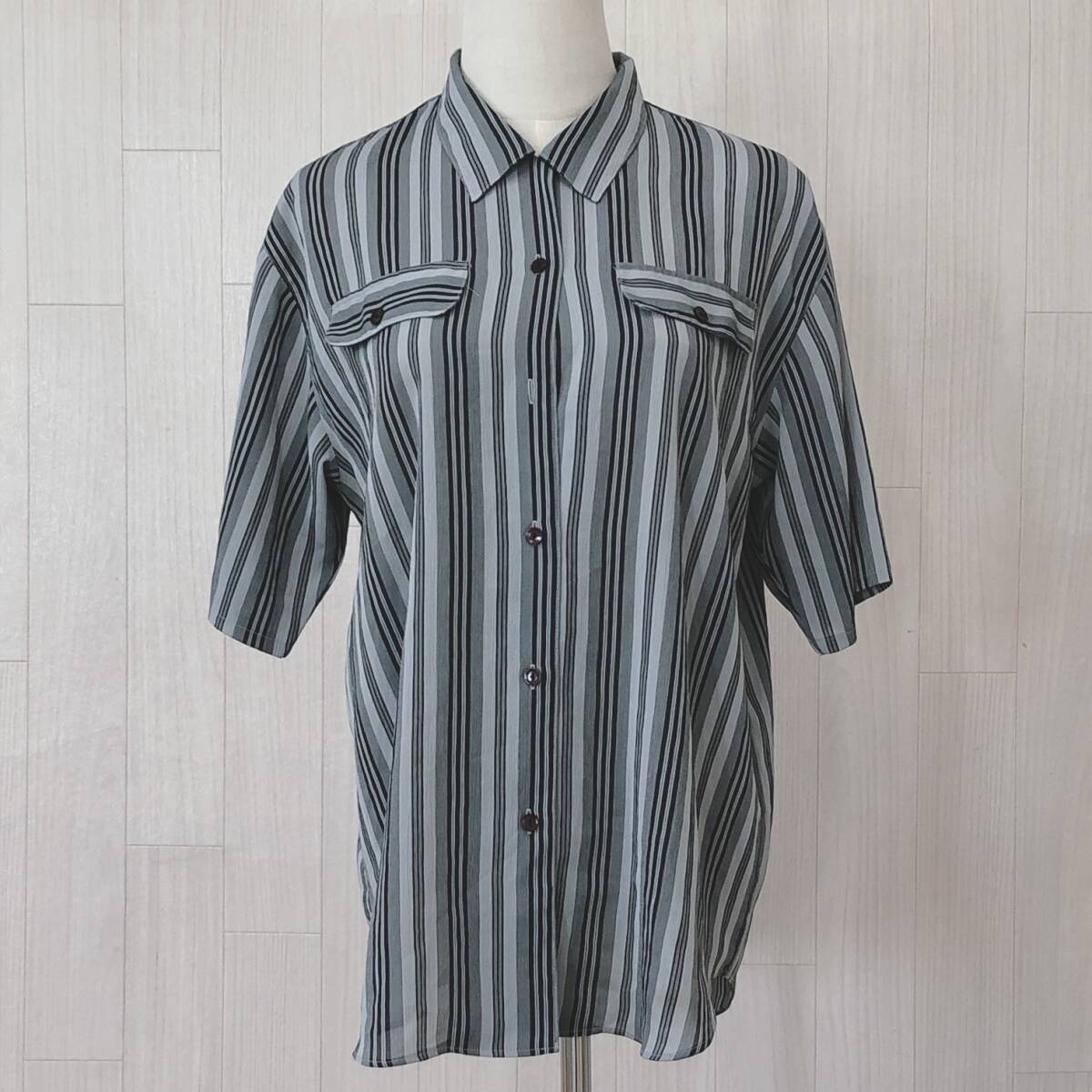 - Y1749 Motomachi blouse レディース トップス ブラウス 半袖 薄手 肩パッド 2つ穴ボタン ストライプ シンプル カジュアル 涼しげ 夏