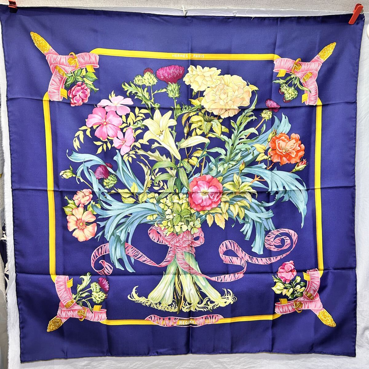 > ★未使用品★90×88cm★ 新品 HERMES エルメス 大判 スカーフ シルク100% フランス製 REGINA 女王陛下 ネイビー 花柄 ギフト (03257C