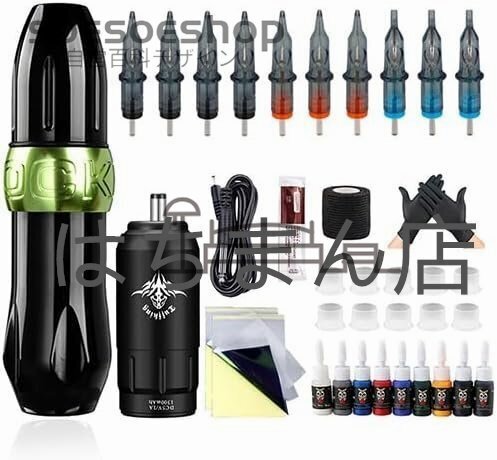 - プロのタトゥーマシン ワイヤレスタトゥーマシンセットカートリッジニードル10本 タトゥー用品のフルセット付き (Color : グリーン)