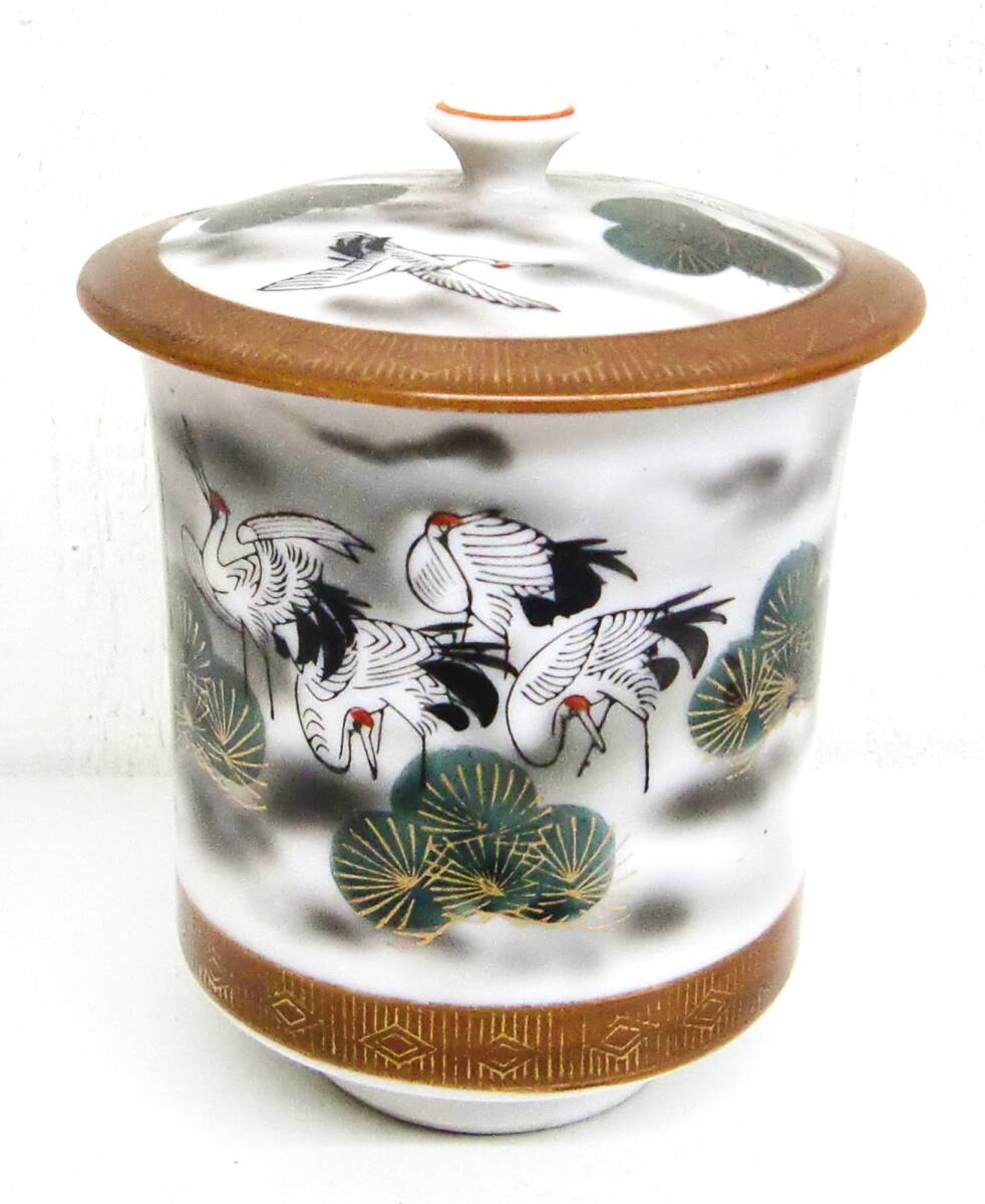 - 伝統工芸 工芸品 工芸美術 *九谷焼 *蓋付き 湯呑 *金彩 色絵 鶴 松 模様 *和食器 茶碗 湯呑 茶器