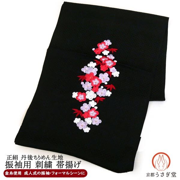 - 正絹 刺繍 帯揚げ 振袖用 ちりめん生地 oa-373 梅 紅葉 黒 ブラック 成人式 結婚式 卒業式 お洒落着物 和装