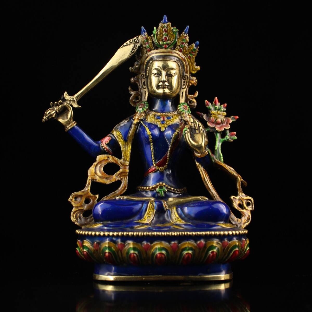 - ▽鴻▽ 銅製 景泰藍 琺瑯彩 文殊菩薩像 置物 古賞物 中国古玩 中国古美術