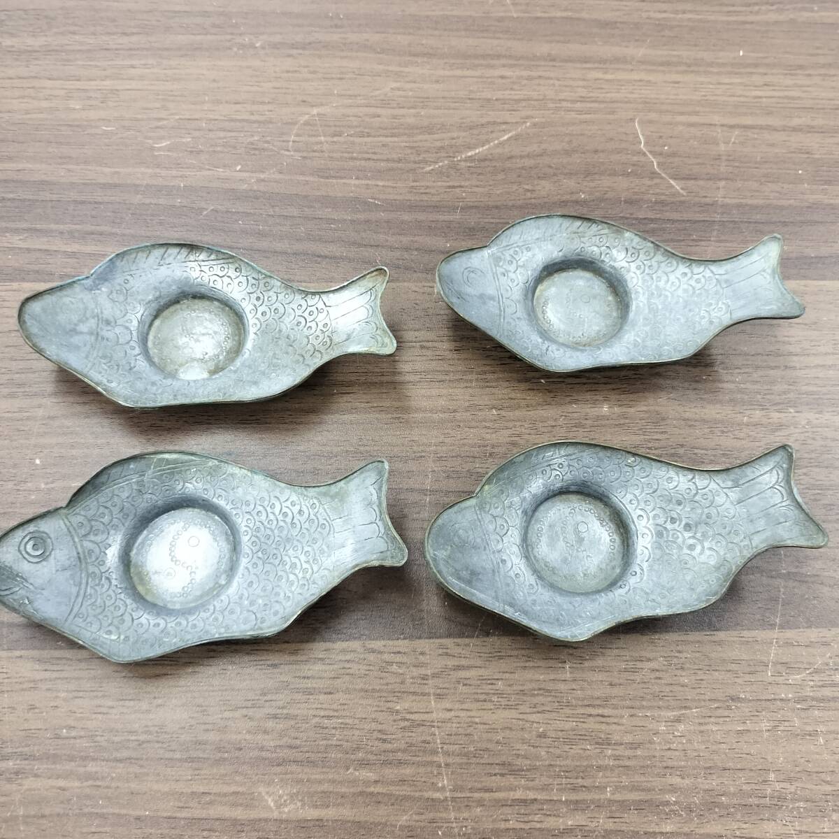 - 中国古玩 中国美術 唐物 『朱石梅製』 本錫細密彫金 魚型 茶托 4客 煎茶道具