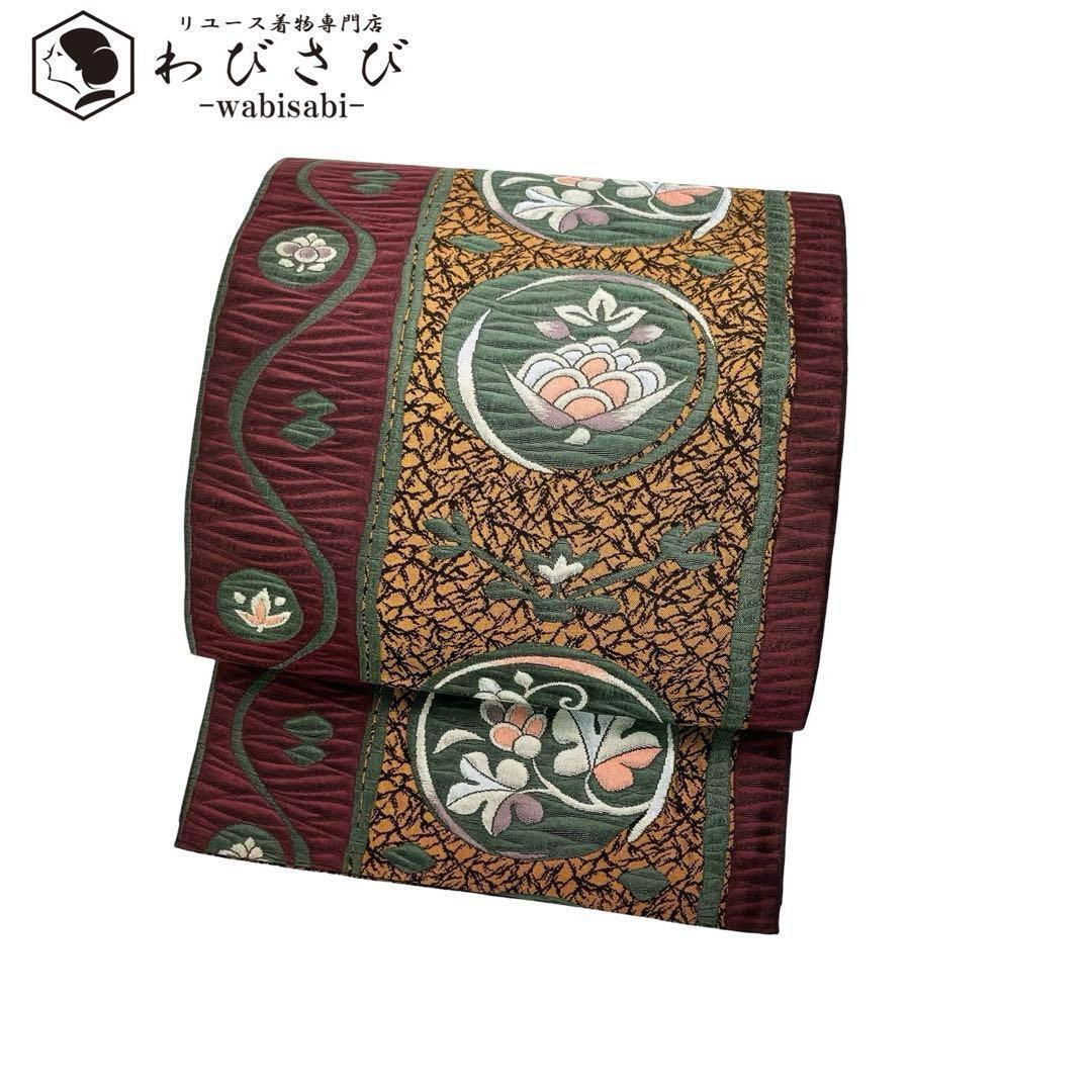 > 名古屋帯 丸に花柄模様 花唐草 金茶色 O-3925 着物 きもの kimono 和服 和装 中古 リサイクル着物 【送料無料】